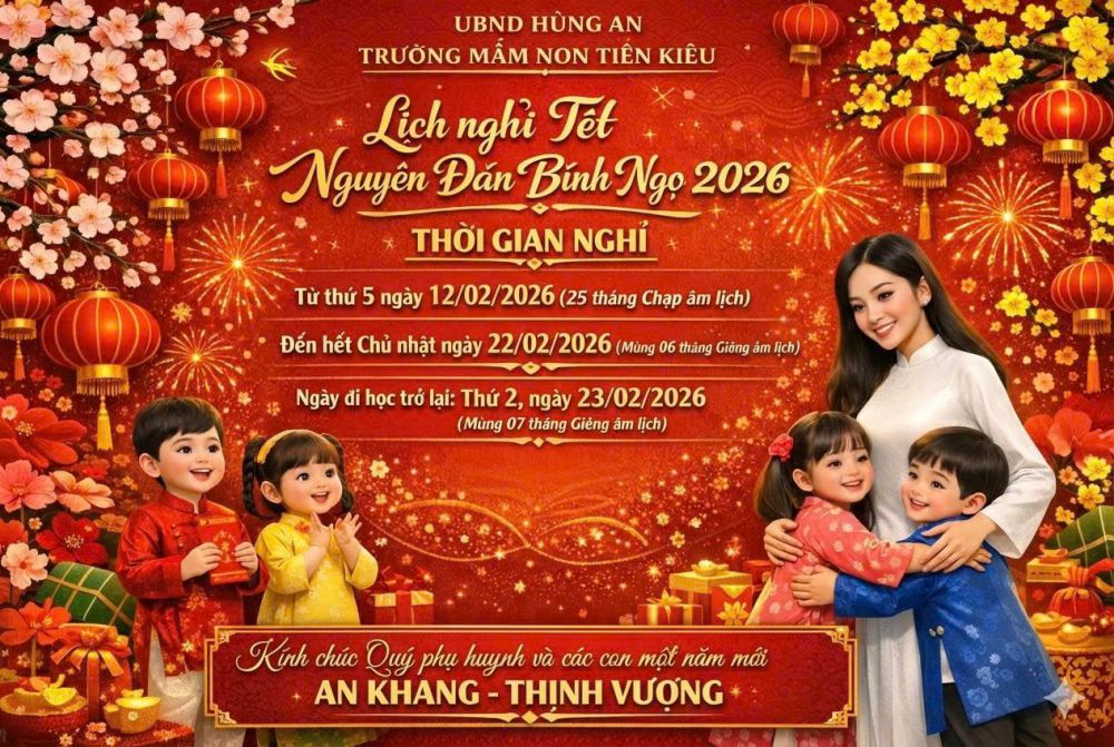 Trường Mầm non Tiên Kiều trân trọng thông báo đến quý phụ huynh lịch nghỉ Tết Nguyên đán Bính Ngọ 2026 như sau: