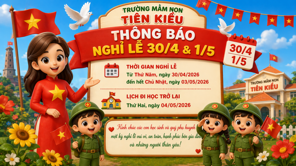 Trường Mầm non Tiên Kiều trân trọng thông báo tới quý phụ huynh và các con học sinh về lịch nghỉ lễ Ngày Giải phóng miền Nam (30/4) và Quốc tế Lao động (1/5) như sau: